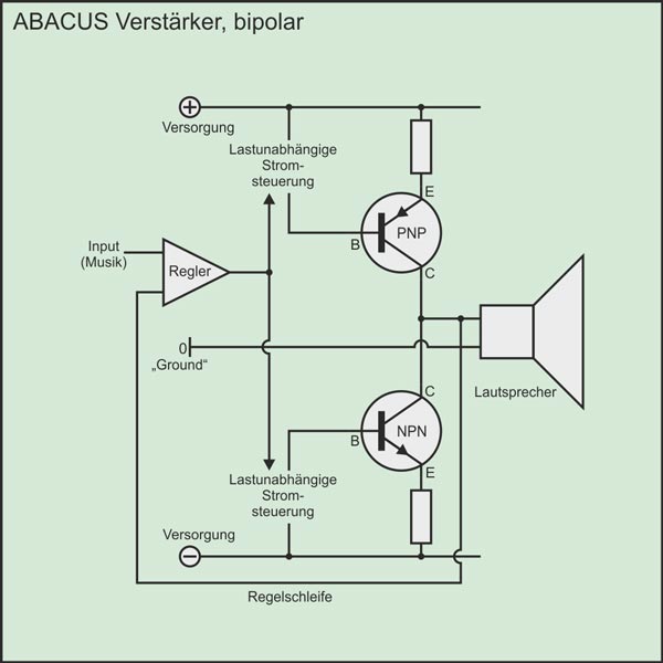 ABACUS-Verstärker verwenden den Kollektor vom Endtransistor als Ausgang. Bei anderen Verstärkerkonzepten wird der Emitter als Ausgang verwendet. Der Kollektor hat aber den Vorteil, dass er lastunabhängig arbeitet. Eine direkte Gegenkopplung stellt sicher, dass der Lautsprecher (plus Kabel) die Signalspannung nicht verändern kann. Der Verstärker liefert immer den passenden Strom und somit bleibt die Ausgangsspannung synchron mit dem Verstärkereingang. Die Membranbewegung ist perfekt synchron mit dem Musiksignal. Mit der ABACUS-Schaltungstechnik werden auch Nachschwinger verhindert.