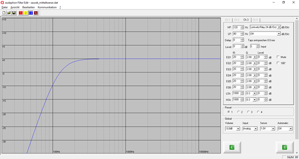 Beim Mitteltöner wird im ersten Schritt der Hochpassfilter bei 120 Hz eingestellt. Man trennt mit einer Flankensteilheit von 24 dB / Oktave um auch bei höheren Pegeln eine verzerrungsfreie Wiedergabe zu gewährleisten.