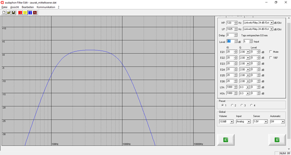 Mit einer Anhebung bei 17.200 Hz um +2,5 dB und einem Gütefaktor von 4 (schmalbandiger Wirkungsbereich) wird der Pegel auf das durchschnittliche 95 dB Niveau vom Hochtöner angehoben.
