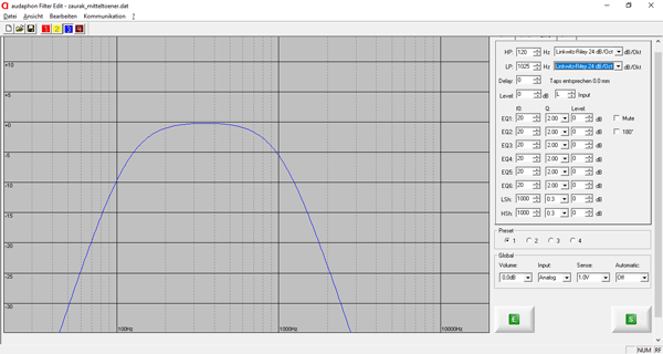 Der Hochpassfilter wird auf 24 dB / Oktave mit Linkwitz-Riley Charakteristik eingestellt. Der blaue Graph zeigt den Hochpassfilter und man kann anschließend den passenden Tiefpass Filter setzen. Es entsteht ein sogenannter Bandpassfilter für den Mitteltonzweig.