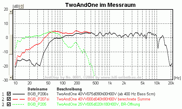 Und hier der Frequenzgang des gesamten Lautsprechers, wie er auf der HiFi-Music-World vom 26.-28.05.2005 in Gelsenkirchen zu hören war: