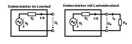 Links der Verstärker ohne angeschlossenen Lastwiderstand Ra, man sagt er sei im Leerlauf. In diesem Falle misst man die ganze innere Leerlaufspannung Ul an den außen zugänglichen Klemmen. Es fließt kein Ausgangsstrom: I=0.