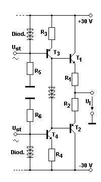 Das nebenstehende Bild zeigt eine typische Transistor-Endstufe in Gegentaktschaltung. Da die für Endstufen-Transistoren erforderliche Versorgungs-Gleichspannung die typischen Werte +30 und -30 V hat, kann die Ausgangs-Wechselspannung Ul im Effektivwert maximal knapp 30 V betragen.