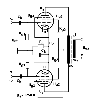 Die nachfolgend gezeigte Schaltung ist die Gegentakt-Endstufe zweier Röhren. Ähnlich wie bei Transistoren ergänzen sich die Röhren bei der Wechselspannungssteuerung: Öffnet die obere, so schließt die untere und umgekehrt. Dieses Wechselspiel erfolgt kontinuierlich mit den Augenblickswerten, da die Steuerung ja kein Schalterbetrieb (voll auf - voll zu), sondern stetige Steuerung mit mehr oder weniger Spannung und Strom darstellt.